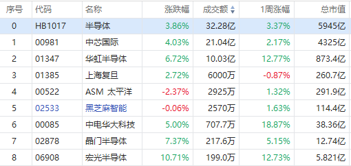 港股半导体股拉升走高,华虹半导体涨近7%,中芯国际涨超4%,上海复旦、英诺赛科涨超2%。