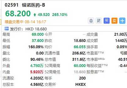 华盛资讯08月14日讯,港股银诺医药-B正在暗盘交易中,截至发稿涨265%,报68.2港元/股,中签一手账面浮盈9904港元,最新总市值超311亿港元。该股预计将于8月15日正式挂牌上市,配售结果将于今日晚间披露。