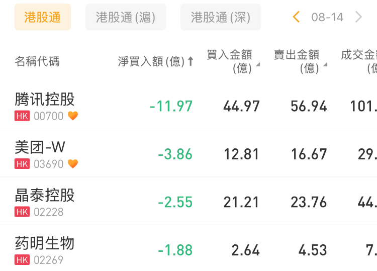 腾讯控股、美团-W、晶泰控股分别遭净卖出11.97亿港元、3.86亿港元、2.55亿港元。