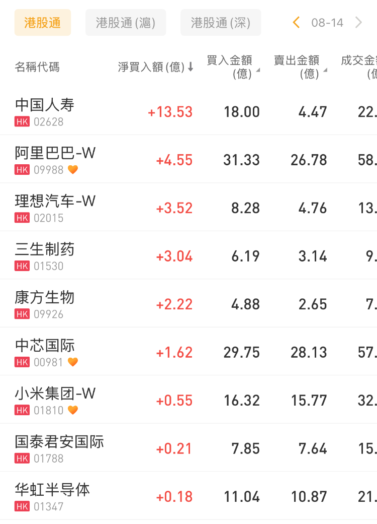 中国人寿、阿里巴巴-W、中芯国际分别获净买入13.53亿港元、4.55亿港元、1.62亿港元;