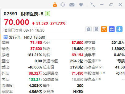 华盛资讯08月14日讯,港股银诺医药-B暗盘收涨274.73%,报70.00港元/股,中签一手账面浮盈10264.0港元,最新总市值超319.77亿港元。
