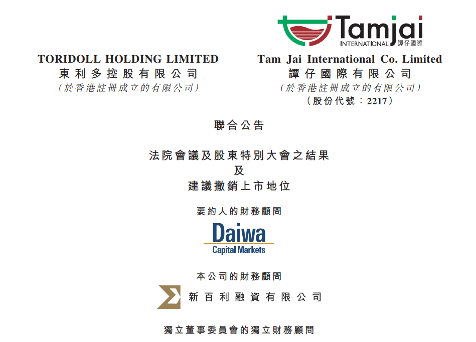 今年2月3日,东利多香港提议将谭仔国际私有化。如若该计划获批准及实施,谭仔国际股份在港交所的上市地位将于生效日期后撤销,东利多香港将以现金支付相应代价,注销价为1.58港元/股。