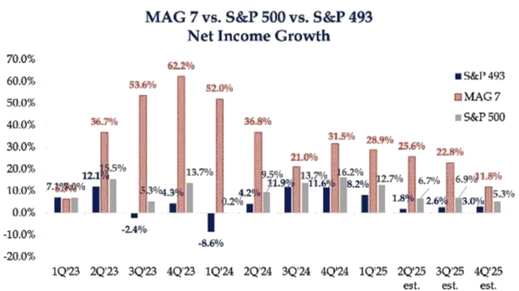 金吾财讯 | 过去一年,美股的亮点无疑集中于“科技七雄”(Magnificent 7)。它们的股价涨幅接近四成,几乎是标普500指数18.6%涨幅的两倍。这并非单纯的估值炒作,而是因为盈利能力确实突出。自2023年第二季起,“科技七雄”的净收入增长全数超过两成,增速最高的甚至达62%,远远抛离标普500整体水平,以及扣除“科技七雄”后的指数表现(图1)。AI热潮的推动,使资金源源涌入科技板块,尤其是这七家行业龙头,亦属情理之中。