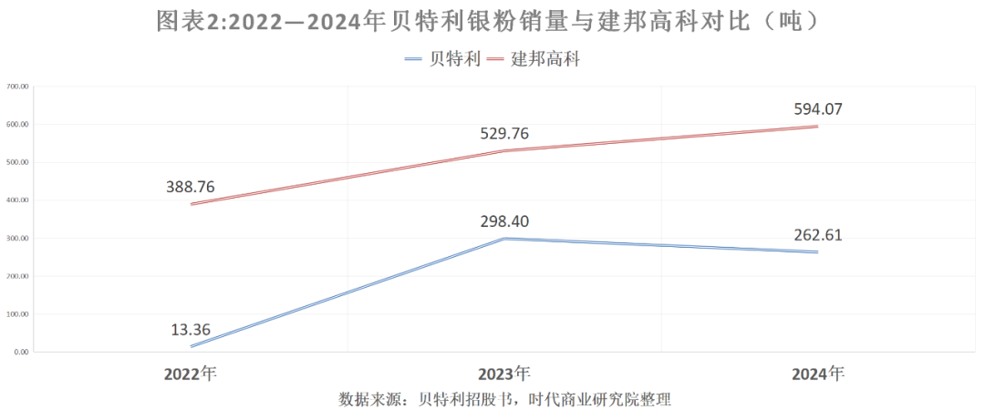 招股书显示,报告期各期,贝特利的银粉销量分别为13.36吨、298.40吨、262.61吨,由此测算,2023—2024年,其银粉销量同比增速分别为2133.53%、-11.99%。相比之下,作为其同行可比公司,招股书显示,建邦高科有限公司的银粉销量分别为388.76吨、529.76吨和594.07吨,呈持续增长趋势。
