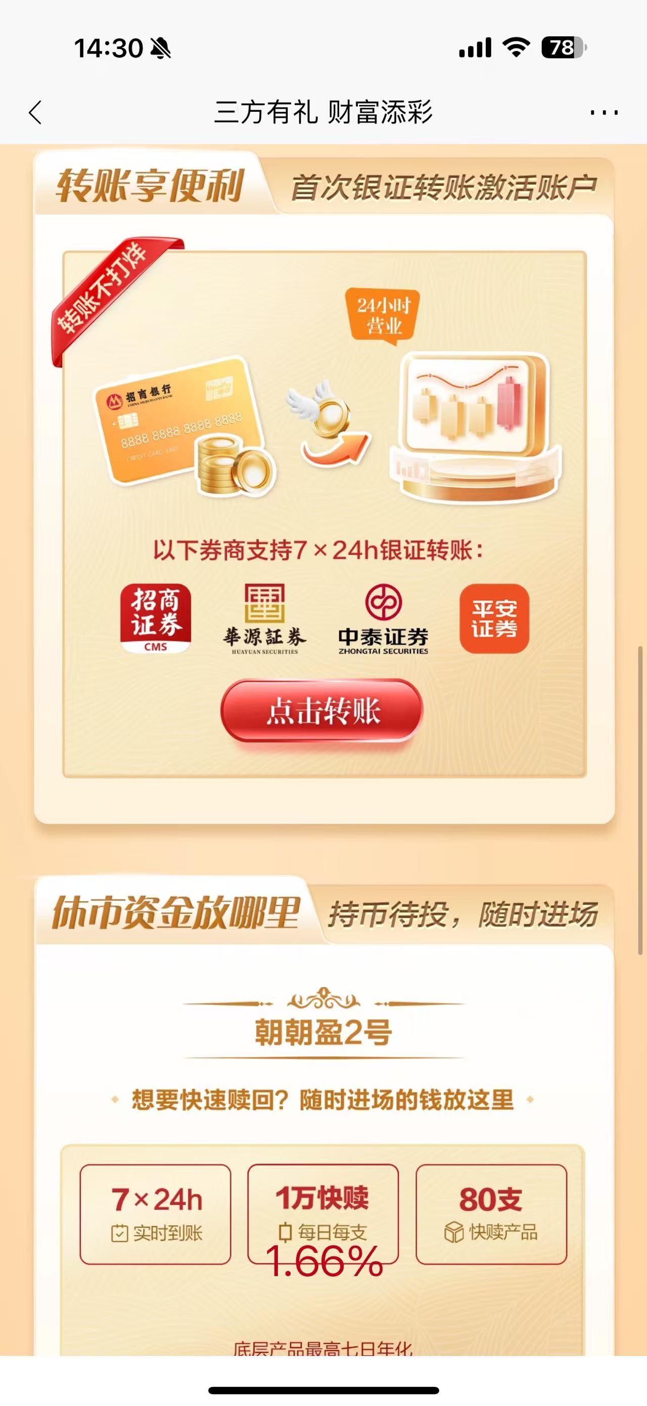 在引流开户的同时,银行也为客户的“休市资金”作出规划,借“持币待投、随时进场”“休市闲钱不躺平”等,吸引客户了解该行自营理财产品,如招行APP就在活动页面上推介了该行的“朝朝盈2号”、7天闲钱理财。