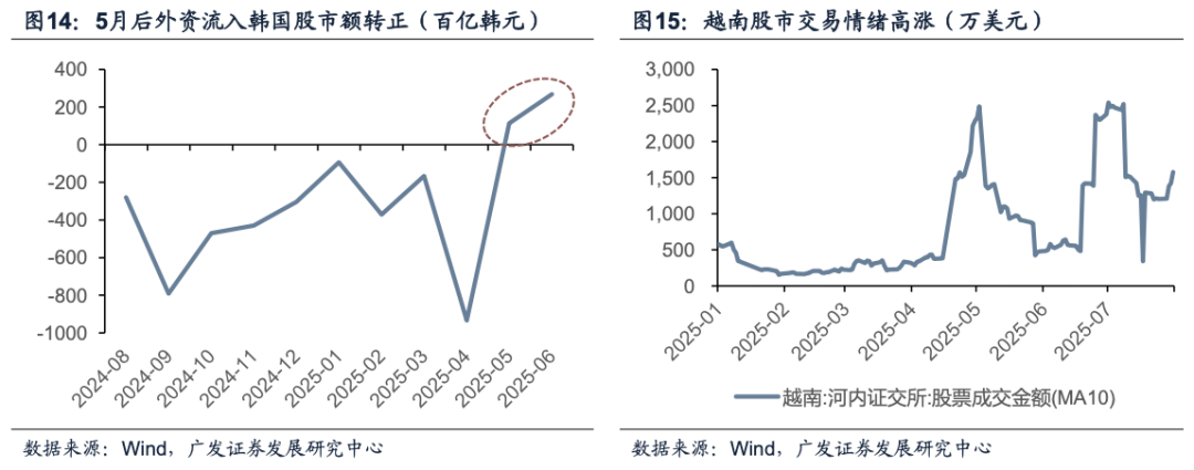 本轮全球资金再平衡的逻辑是,在美国基本面、美元和美债信用的走弱的背景下,美联储被迫重启降息,资金流向短期景气度强于美国的非美资产。在上述逻辑下,以下资产或将持续受到全球资金青睐:(1)与美元具有直接替代性质的黄金、Crypto等避险资产。(2)财政或货币政策转向、基本面具有复苏预期的其他发达国家资产(如欧元、欧股、日元等)。(3)其他基本面或政策面存在重要边际变化,且兼具胜率和赔率的新兴市场资产(如韩国、越南、巴西等)。