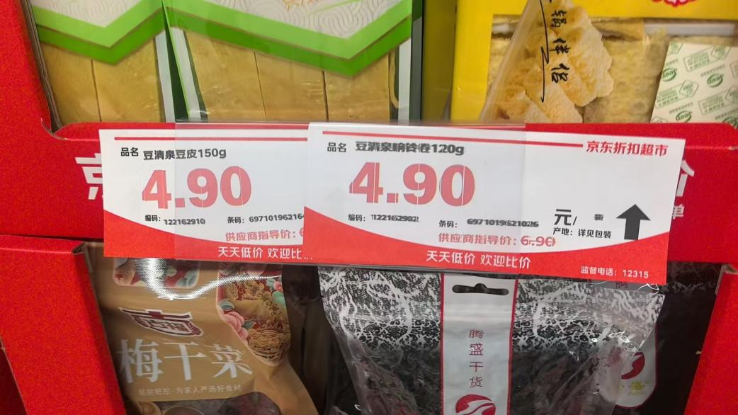 低价是超市内最突出的标签。在超市墙壁、货架、价签等各个地方,都展示着“天天低价”的标语,超市内,还设立了9.9元/斤、19.9元/斤等低价商品专区。商品价签上清晰标注着超市售价与供应商指导价,形成直观对比。如某款响铃卷,超市售价4.9元,供应商指导价为6.9元,便宜了约29%。