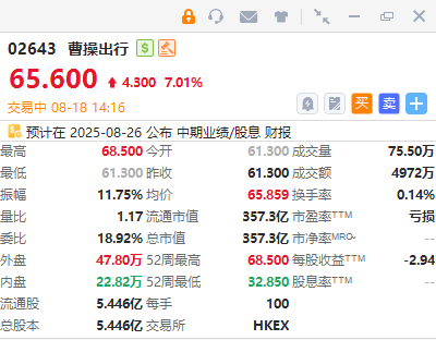 智通财经APP获悉,曹操出行(02643)涨超7%,盘中高见68.5港元再创上市新高。截至发稿,涨7.01%,报65.6港元,成交额4972万港元。
