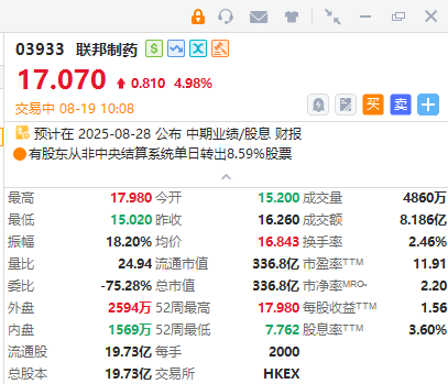 消息面上,8月18日,联邦制药发布公告,预期本集团截至2025年6月30日止6个月的净溢利约为人民币18.5亿元,而截至2024年6月30日止6个月的净溢利约为人民币14.91亿元。
