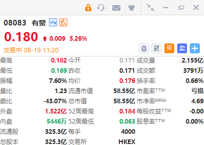 有赞(08083)涨超5%,截至发稿,涨5.26%,报0.18港元,成交额3791万港元。