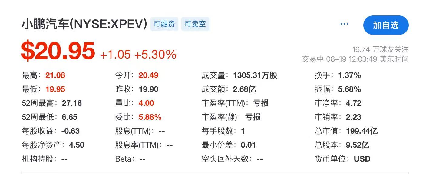 8月19日,小鹏汽车港股(09868.HK)下跌1.85%,收报77.05港元/股。二季报发布后,小鹏汽车美股(NYSE:XPEV)涨幅一度逼近6%,截至发稿(美东时间19日12时03分),小鹏汽车美股涨5.3%,报20.95美元。
