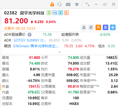 舜宇光学科技(02382)绩后涨超8%,截至发稿,涨8.34%,报51.2港元,成交额超13亿港元。