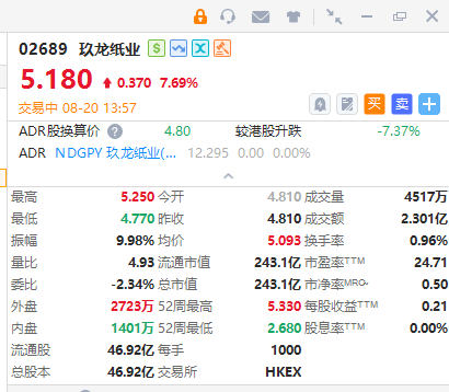 玖龙纸业(02689)午后涨超7%,截至发稿,涨7.69%,报5.18港元,成交额超2亿港元。