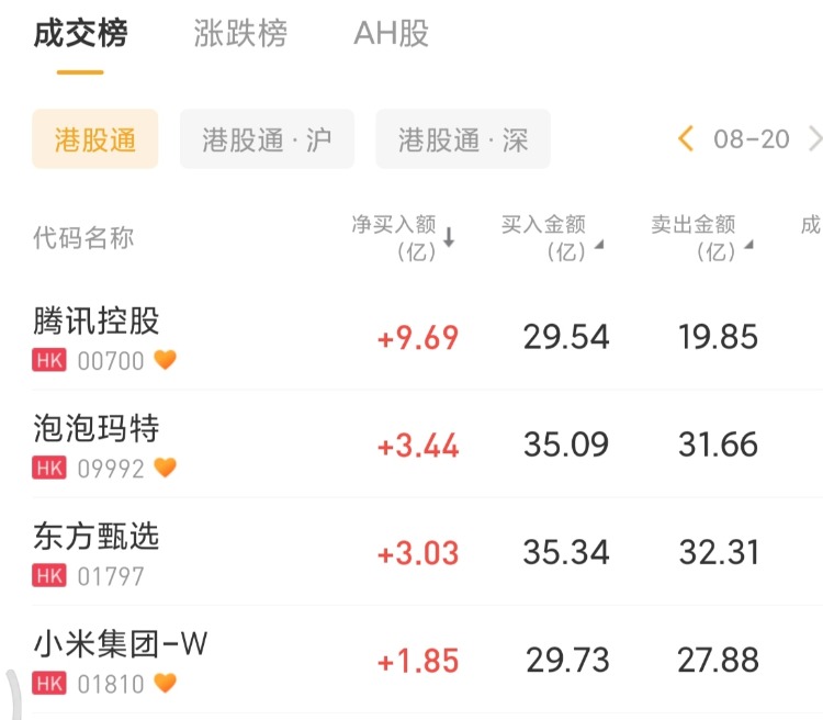腾讯控股、泡泡玛特、东方甄选分别获净买入9.69亿港元、3.44亿港元、3.03亿港元。