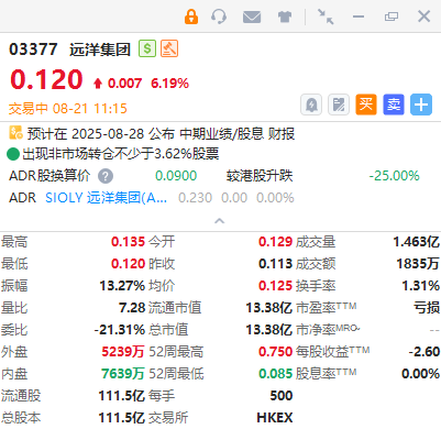 远洋集团(03377)涨逾6%,截至发稿,涨6.19%,报0.12港元,成交额1835万港元。