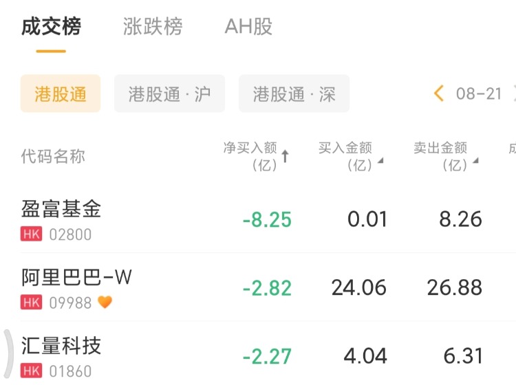 盈富基金、阿里巴巴-W、汇量科技分别遭净卖出8.25亿港元、2.82亿港元、2.27亿港元。