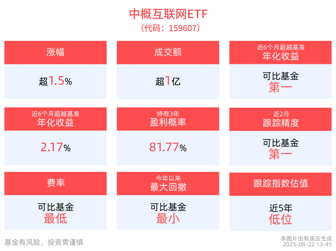 截至8月20日,中概互联网ETF近1年净值上涨40.41%。从收益能力看,截至2025年8月20日,中概互联网ETF自成立以来,最高单月回报为40.52%,最长连涨月数为4个月,最长连涨涨幅为24.85%,上涨月份平均收益率为8.53%。