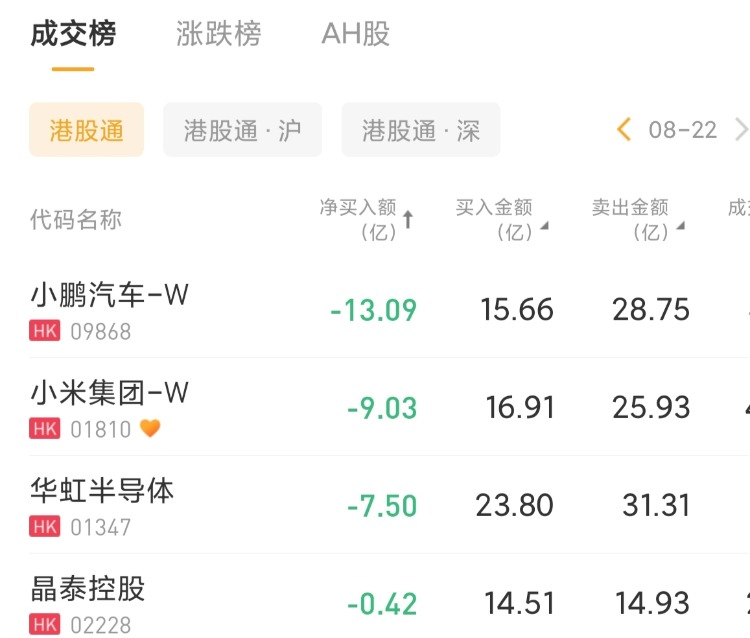 小鹏汽车-W、小米集团-W、华虹半导体分别遭净卖出13.09亿港元、9.03亿港元、7.5亿港元。