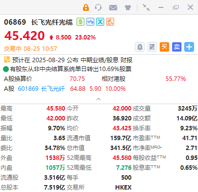 长飞光纤光缆(06869)早盘涨超20%,盘中高见45.58港元创历史新高。截至发稿,涨23.02%,报45.42港元,成交额14.09亿港元。