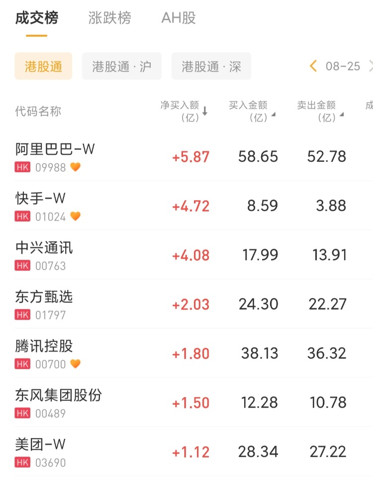 阿里巴巴-W、快手-W、中兴通讯分别获净买入5.87亿港元、4.72亿港元、4.08亿港元。
