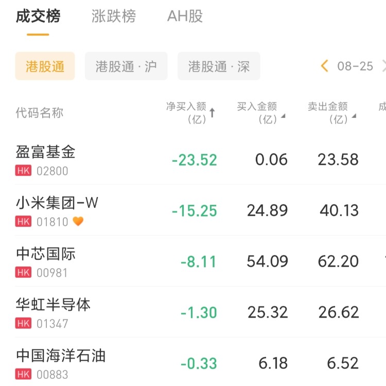 盈富基金、小米集团-W、中芯国际分别遭净卖出23.52亿港元、15.25亿港元、8.11亿港元。