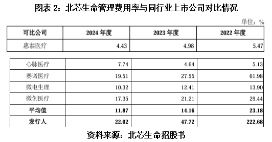 招股书显示,报告期各期,北芯生命管理费用分别为2.06亿元、0.88亿元、0.70亿元,管理费用率分别为222.68%、47.72%、22.02%。