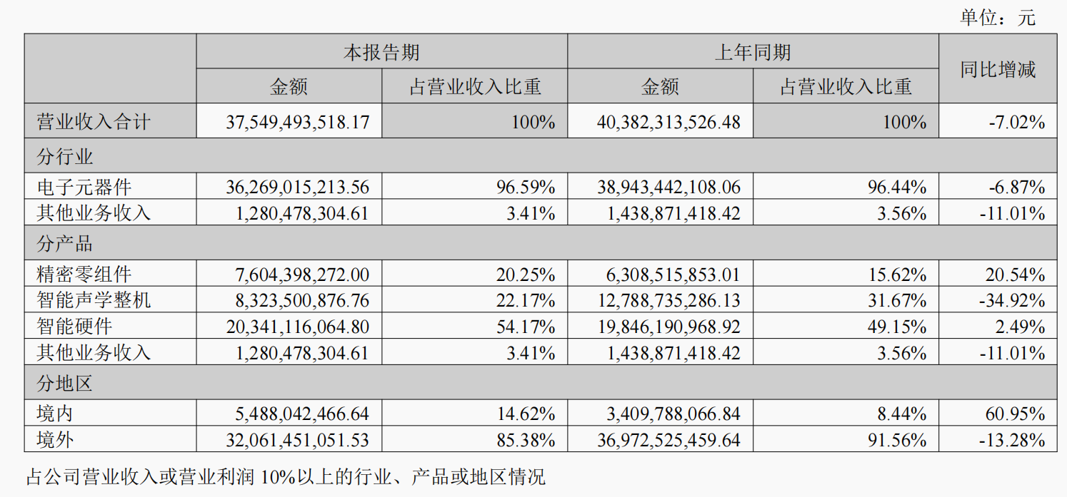 在业务端,歌尔股份上半年在智能声学整机业务上收入83.24亿元,同比降低了34.92%,该项业务占总营收比例为22.17%。另外两项占比较大的业务精密零组件和智能硬件分别实现了20.54%和2.49%的增长。