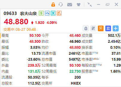 农夫山泉(09633)涨超4%,截至发稿,涨4.09%,报48.88港元,成交额2.454亿港元。