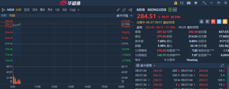 数据库公司MONGODB盘中股价大涨超30%。消息面上,公司昨日发布Q2财报,Q2营收达5.9亿美元,同比增长24%,全年营收指引超市场预期。同时,巴克莱银行维持公司买入评级,上调目标价至305美元。