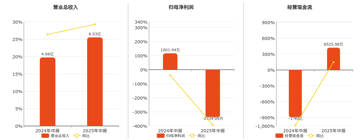 公司营业总收入为6.03亿元,较去年同报告期营业总收入增加1.36亿元,实现3年连续上涨,同比较去年同期上涨29.26%。归母净利润为-2939.09万元。经营活动现金净流入为6525.98万元,在已披露的同业公司中排名第88,较去年同报告期经营活动现金净流入增加2.05亿元。