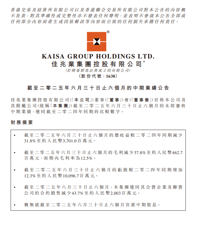 8月28日晚间,佳兆业集团(01638.HK)公布2025年中期业绩公告,上半年实现营收37亿元,同比减少31.8%;上半年净亏损100.3亿元,上年同期净亏91.15亿元;上半年毛利减少37.8%至4.63亿元,毛利率为12.5%;集团连同合营企业以及联营公司的合约销售减少43.7%至20.03亿元。