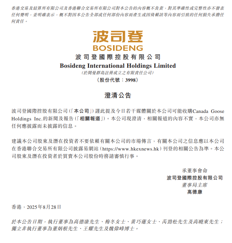 8月29日,波司登(03998.HK)在港交所公告,公司谨此提及今日若干媒体关于本公司可能收购Canada Goose Holdings Inc.的相关报道。本公司现澄清,相关报道的内容不实,公司亦无任何应披露而未披露的信息。前一日,安踏体育(02020.HK)同样发布澄清公告,称其并非该潜在收购的一方。