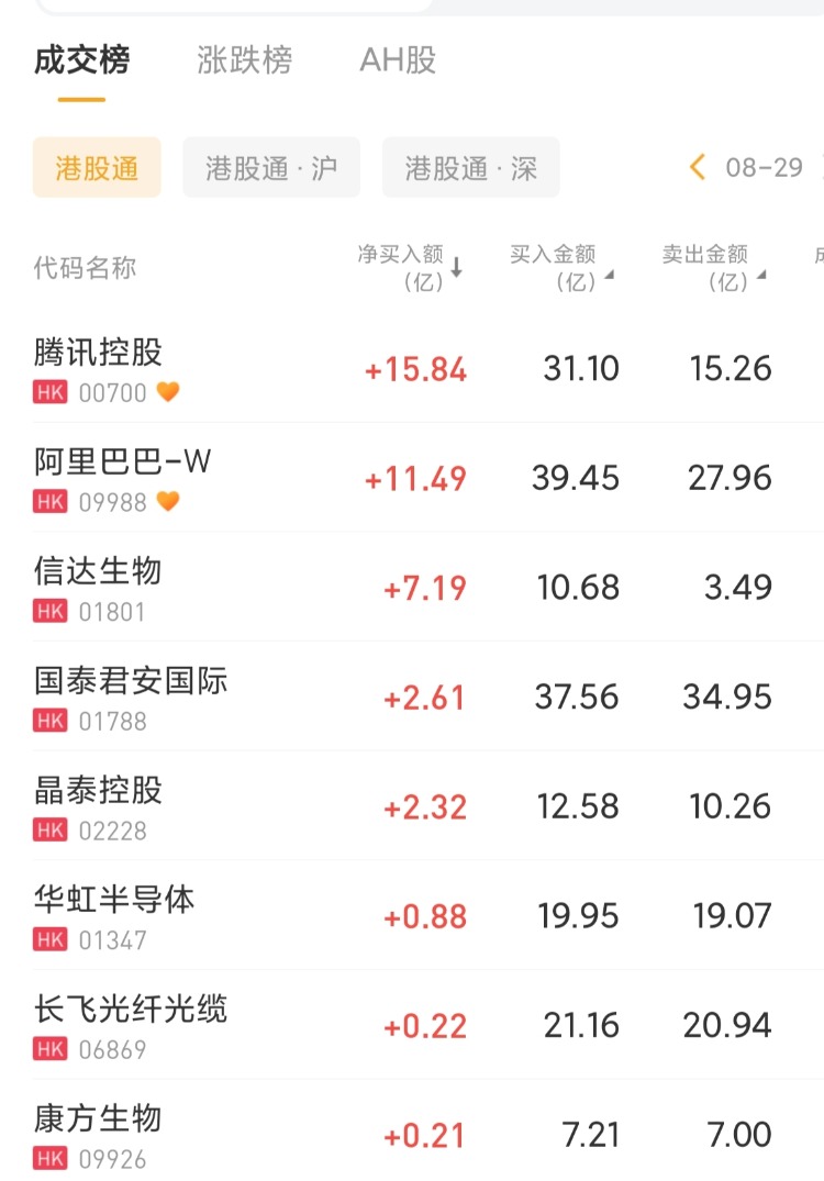 腾讯控股、阿里巴巴、信达生物分别获净买入15.84亿港元、11.49亿港元、7.19亿港元。