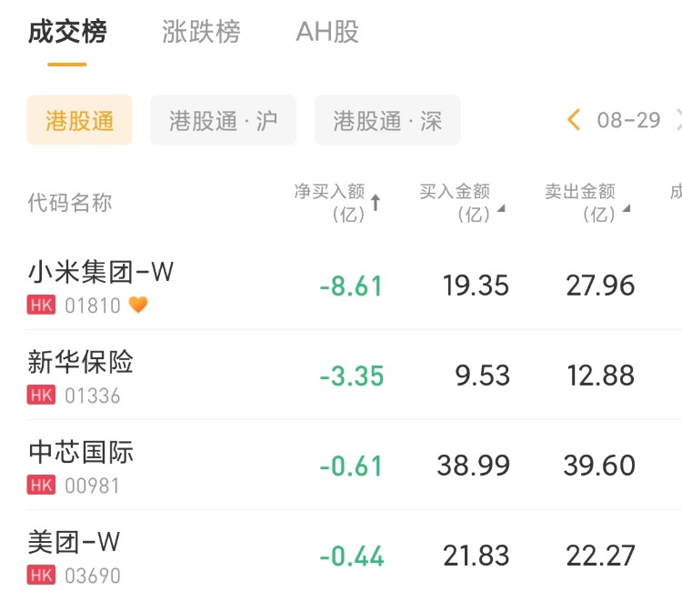 小米集团、新华保险、中芯国际分别遭净卖出8.61亿港元、3.35亿港元、6,147万港元。