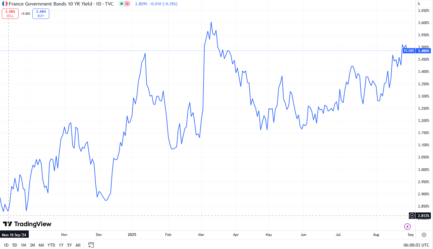 The crisis has pushed French bond yields higher, signaling a rise in borrowing costs that the government can no longer manage without a drastic cut in spending. Yields on 10-year French government bonds surged past 3.5% on Tuesday, before easing back slightly.