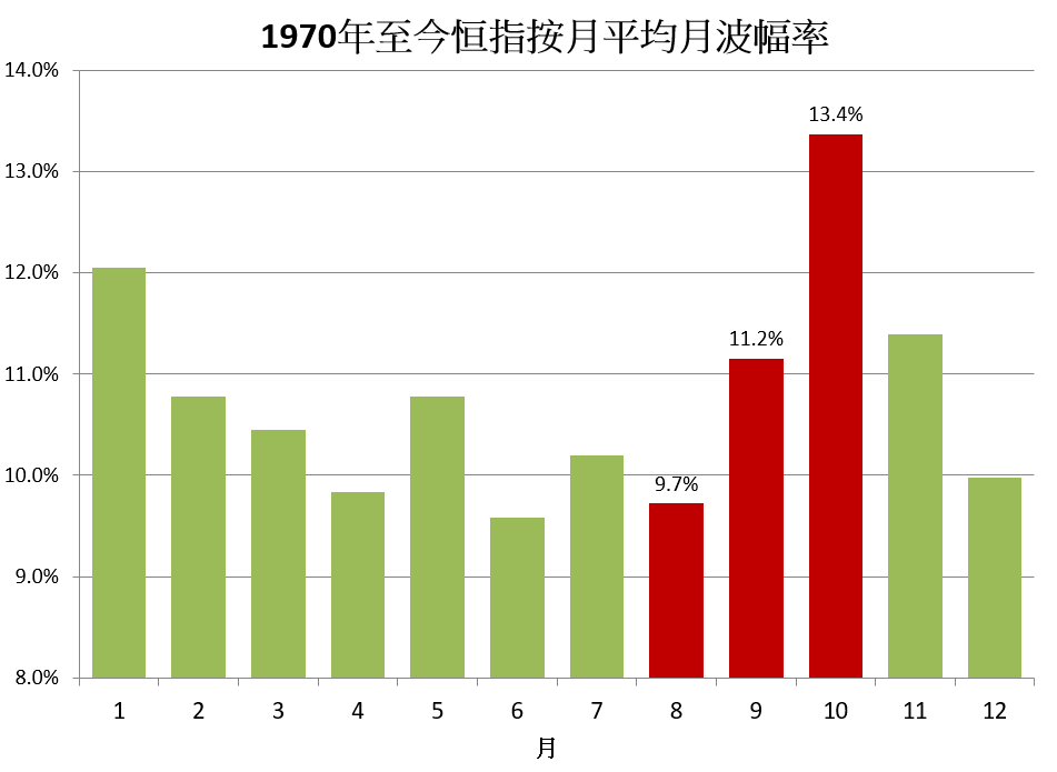 以每月最高价减去最低价,再除以上月收市价计算波幅率后发现,恒指月波幅在8月通常处于全年低位,平均仅约9.7%,随后9月及10月则逐步上升,分别达11.2%及13.4%。值得留意的是,10月的平均月波幅率为全年最高(图1)。