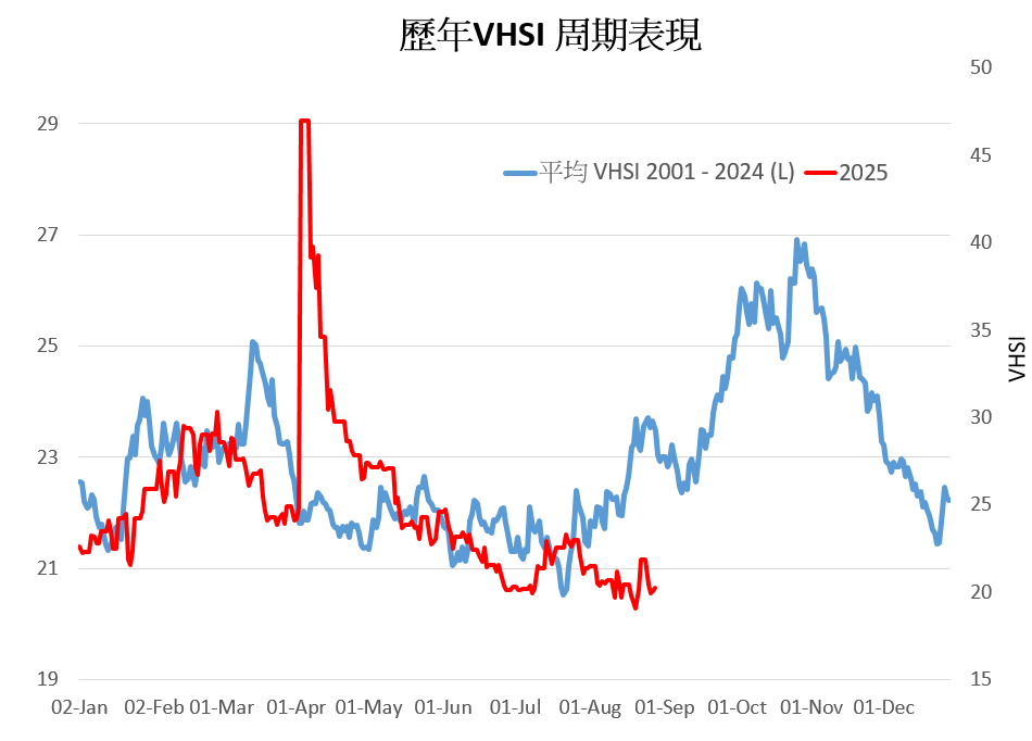 统计2001年至2024年间VHSI的全年平均水平,可见其在8月见底后,呈持续上升趋势,直至10月底触及全年高位后才开始回落(图2)。至于今年,除4月因关税因素导致一轮急升外,首七个月的VHSI表现大致平稳,目前8月尚未完全呈现历史平均的上行态势。
