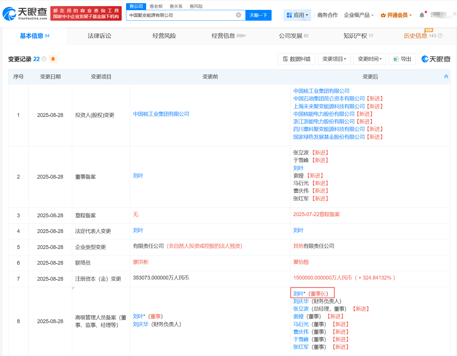 据天眼查,近日中国聚变能源有限公司高层人事发生调整,刘叶由董事变更为董事长,并新增多位主要管理人员。同日,公司注册资本由353073万元增资至1500000万元。中国聚变能源有限公司于7月22日在上海挂牌成立,为中国核工业集团有限公司全资子公司,法定代表人为刘叶。经营范围涵盖新兴能源技术研发、核电设备成套及工程技术研发、能量回收系统研发、发电技术服务等领域。