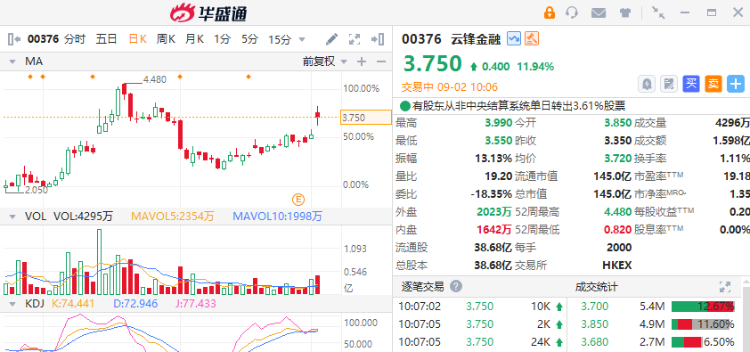 9月2日讯,港股云锋金融(00376)高开14.93%,现涨12%,当前成交额1.6亿港元