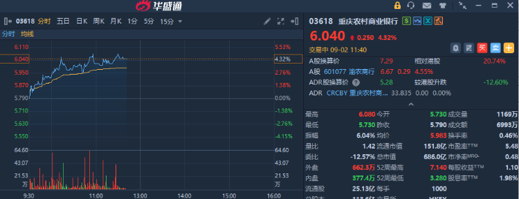 9月2日消息,内银股集体走高,截至发稿,重庆农村商业银行涨超4%,农业银行涨超3%,中信银行、中国光大银行、建设银行、邮储银行、招商银行涨超2%。