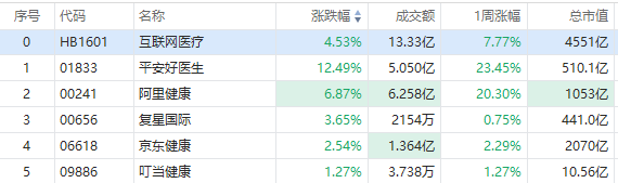 9月3日讯,港股互联网医疗概念集体走高,平安好医生大涨12%,阿里健康涨近7%,京东健康、叮当健康跟涨。