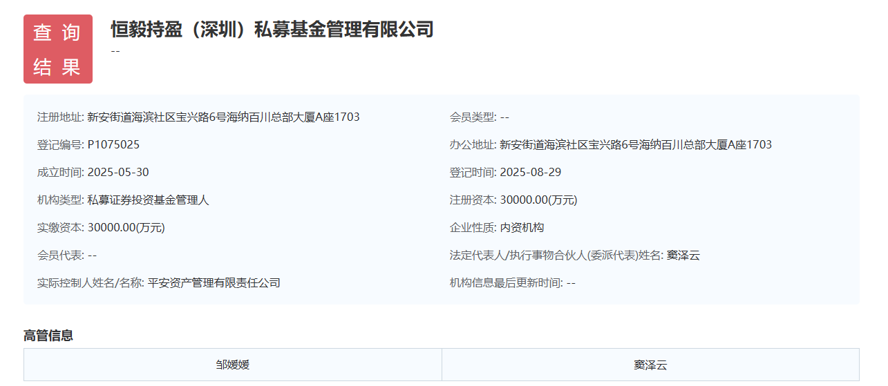 8月29日,恒毅持盈(深圳)私募基金管理有限公司正式在中国基金业协会完成备案。该基金成立于2025年5月30日,注册资金和实缴资金规模均为3亿元。
