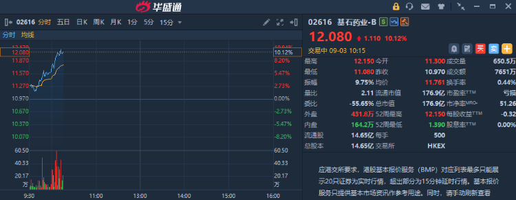 华盛资讯9月3日讯,港股创新药延续涨势,基石药业-B涨近10%,四环医药涨近8%,恒瑞医药升近6%。
