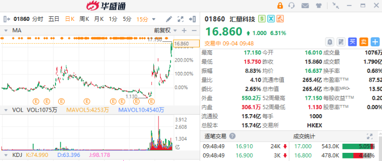 9月4日讯,港股汇量科技(01860)今日盘中再涨8%,截至发稿,涨6.3%,报16.86港元,成交额1.79亿港元。