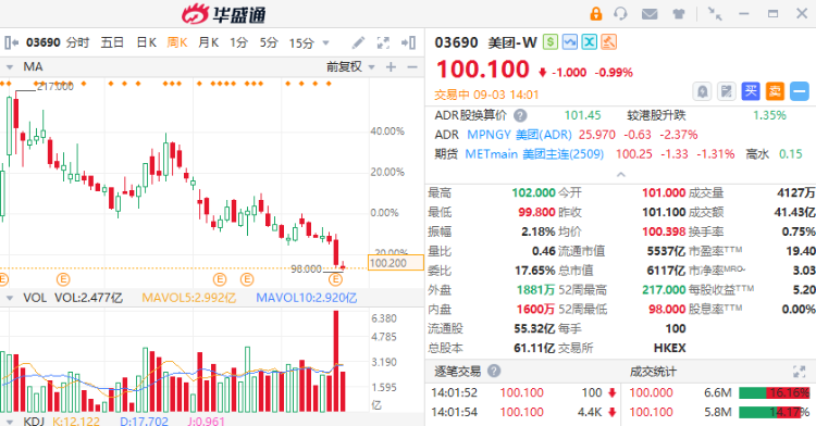 美团-W(03690)早前公布业绩后急跌,股价由120港元附近急回,近3个交易日均曾试穿百元关口,轮场资金积极入场博反弹。
