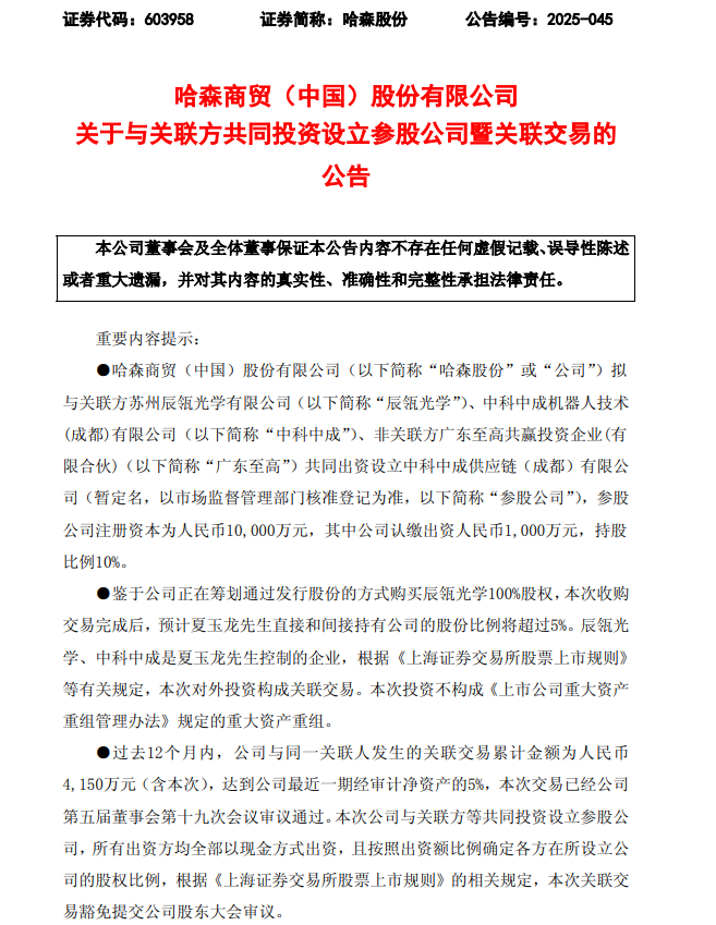 9月3日,哈森股份(603958.SH)公告,公司拟与关联方苏州辰瓴光学有限公司、中科中成机器人技术(成都)有限公司、非关联方广东至高共赢投资企业(有限合伙)共同出资设立中科中成供应链(成都)有限公司(简称“参股公司”)。参股公司注册资本为1亿元,其中公司认缴出资1000万元,持股比例10%。参股公司主要从事机器人零部件、产品等采购、销售业务及相关技术服务等。