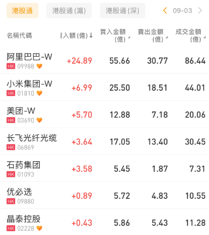 阿里巴巴-W、小米集团-W、美团-W分别获净买入24.89亿港元、6.99亿港元、5.7亿港元;