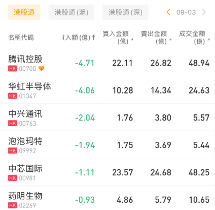 腾讯控股、华虹半导体、中兴通讯分别遭净卖出4.71亿港元、4.06亿港元、2.04亿港元。