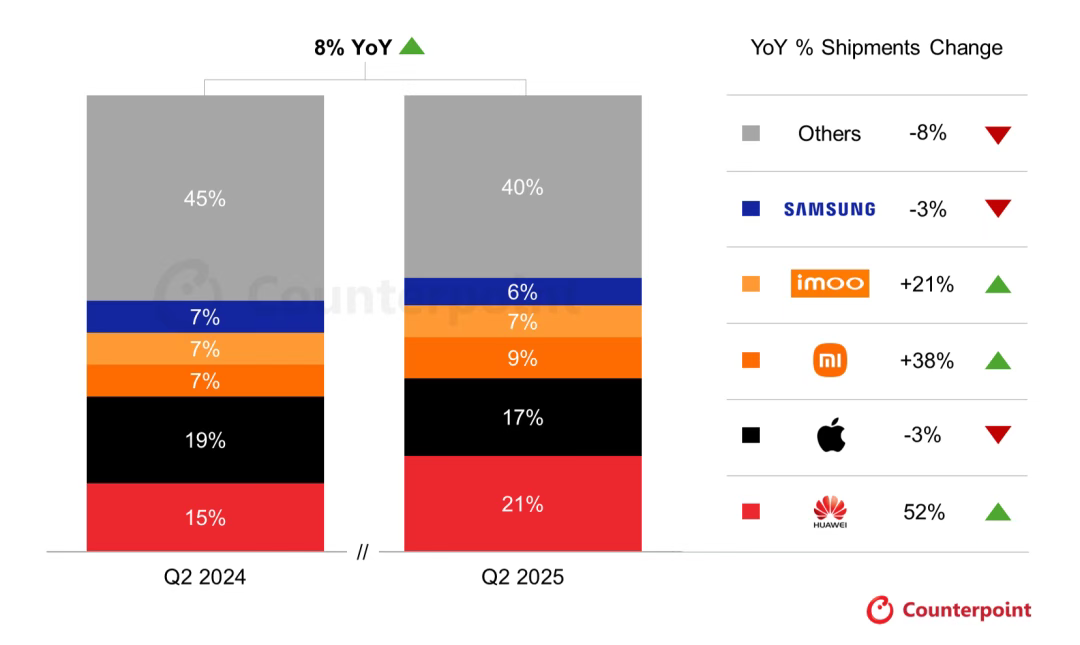 9月3日,根据Counterpoint Research《2025年Q2全球智能手表出货量追踪》报告,华为的智能手表出货量在当季首次超越苹果,成功跃居全球第一。当季全球智能手表出货量同比增长8%,这是自2024年Q1以来连续五个季度下滑后的首次回暖,而中国市场则在本季度的增长中扮演着重要角色。此次复苏主要受益于消费者需求的持续回升,尤其是华为、小米与小天才等品牌在中国市场的带动。中国智能手表市场的快速扩张背后,是健康意识的提升、AI与物联网(IoT)的深度融合,以及消费者对多功能、生态化设备的青睐。