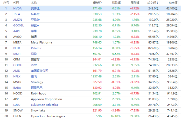 周四美股成交额第1名英伟达收高0.60%,成交242.0亿美元。